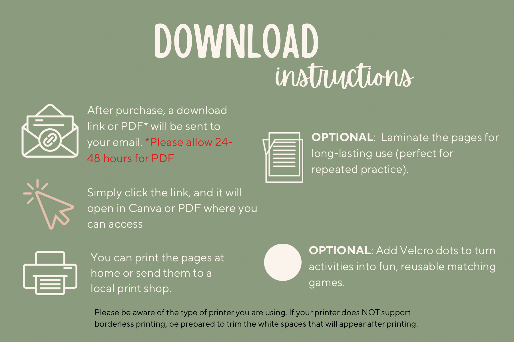 - Files are personalized with your child’s name. Please allow 24–48 hours for email, as we will be personally adding the name to your document before sending you the download.